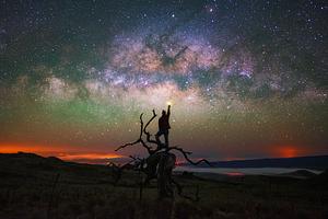 The Milky Way hovers with a glow from Hilo town on the left and Kilauea volcano on the right. I decided to climb up this skeletal tree and capture a silhouette.
