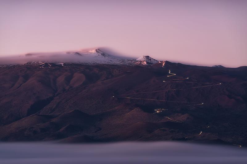 Mauna Kea at dusk as cars descend the mountain after sunset. Big Island, Hawaii.